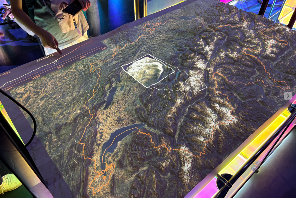 パビリオン内には、アルプスの少女ハイジにちなんだカフェスペースがあり、展示は生成AIや3Dプリンタ、大きなスクリーンとプロジェクタを積極的に活用していました。将来の仕事や生活をAIで無数に画像化したり、気候変動によって溶けるアルプスの氷河の様子を可視化したりしていました。気候変動により白化し、消滅するサンゴ礁を再生するための装置も展示されており、それは3Dプリンタで自動化して作成できるそうです。