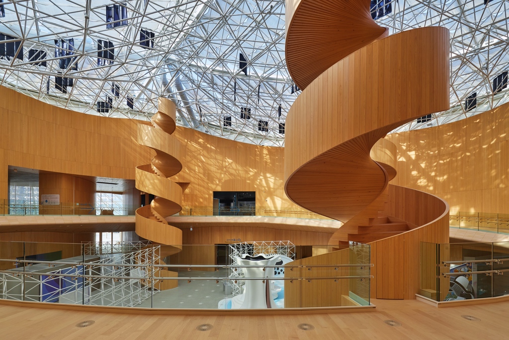 そのほか、大阪府内産の木材を使うことで「地産地消」「ローカル域の循環」を大事にしました。アトリウムに自然光を取り込むことで、照明に使う電力量を減らしています。次世代型の太陽電池であるペロブスカイト太陽光発電パネルをパビリオンの屋根に取りつけました。