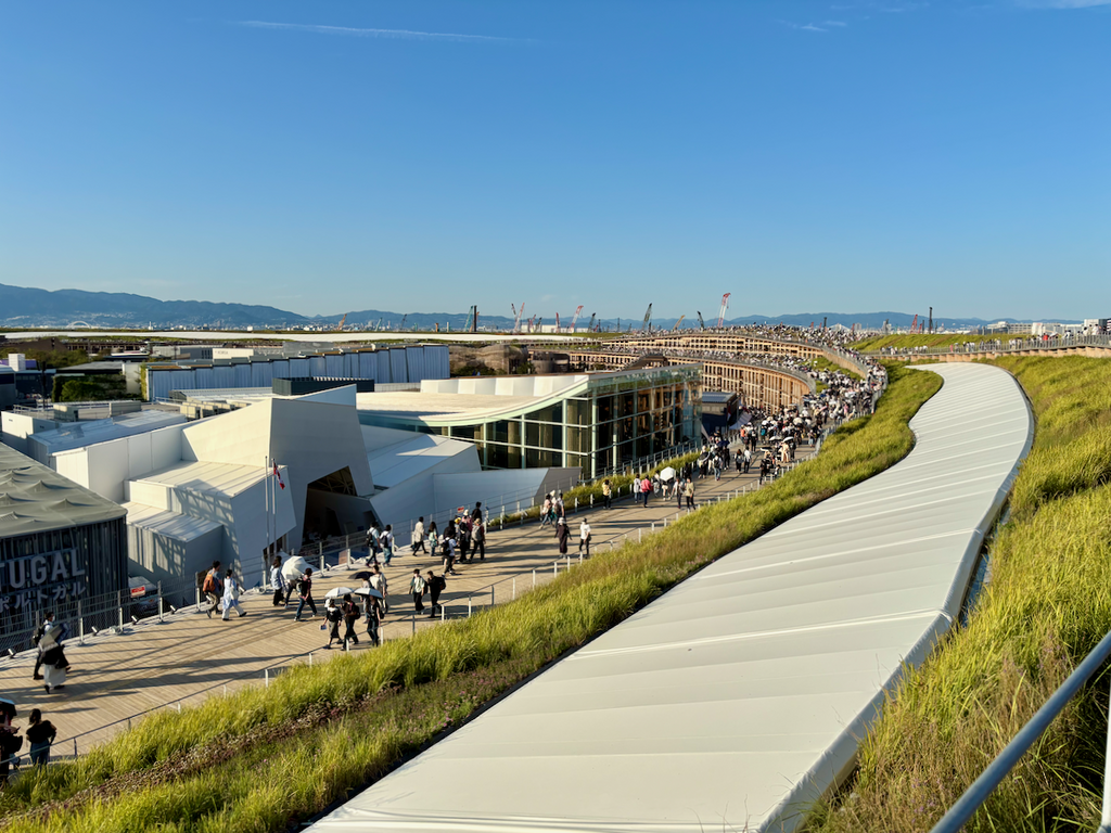 一番、目を引くのは「大屋根リング」でした。会場をぐるっと囲むように木の建築が立っていて、その上と下を歩けます。上は植栽もされ、海風も吹いており、気持ちのよい空間でした。家族連れが大屋根リングの上で遊んだり、ゆっくり休んだりしていたのは印象的です。