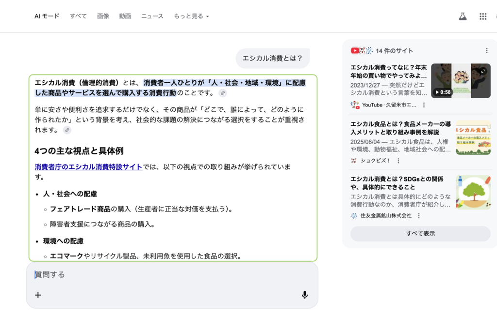 AIの答えの右側には、AIが「答え」を作った時に参考にしたサイトのうち、重要なものが示されます。ここをクリック(タップ)すると、AIの答えの「根拠」を自分で確かめられます。