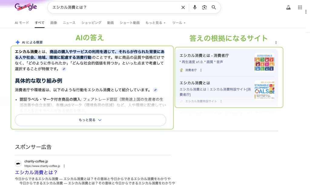 AIがインターネット上の情報をまとめた「要約」が、AIの答えとして表示されます。