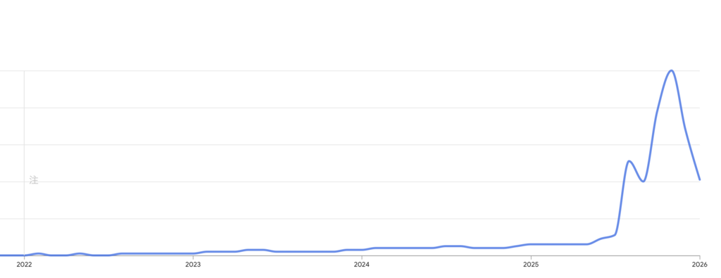 2025年の秋冬くらいから、「AIバブル」という言葉の検索数が、世界でも日本でもぐっと増えました。AIへの投資が加熱しすぎていて、実際に役に立つかが未知数な状況だと、バブルがはじけるかもしれない、という見方です。AIバブルの崩壊があれば、世界の金融にも悪影響が出るでしょう。それは懸念のひとつです。(下のグラフは、世界中のGoogleで”AI bubble”が検索された数。)